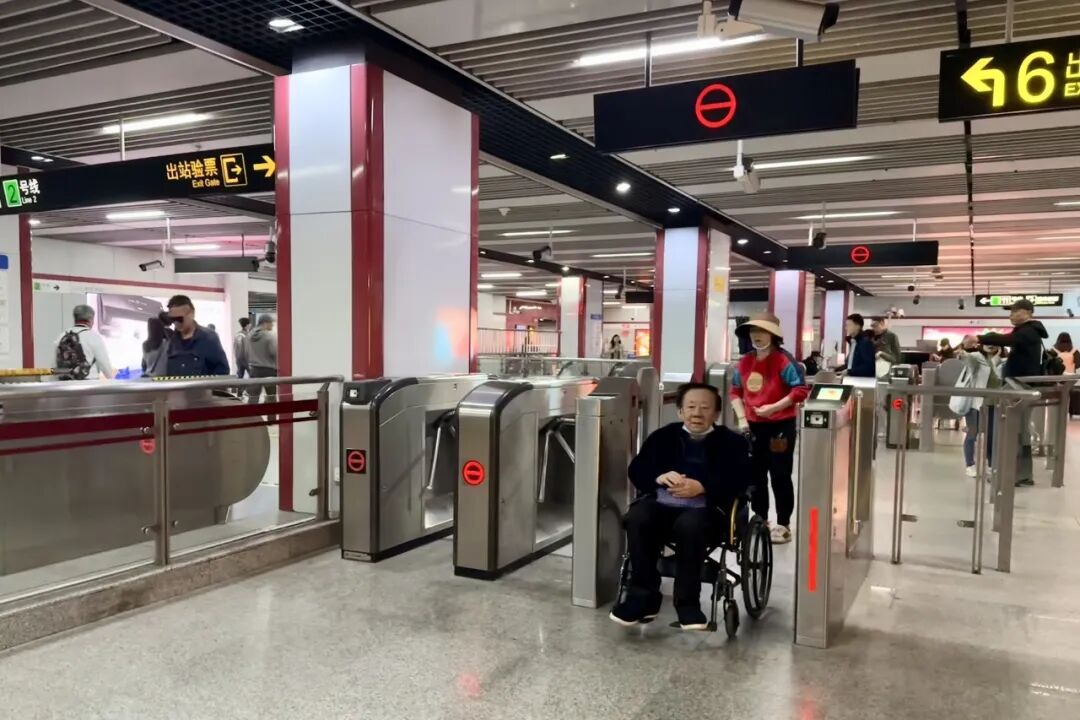 上午,记者来到江苏路地铁站7号口,看到现场通行客流络绎不绝,其中不乏推着轮椅和携带大件行李的乘客,大家通过进出站闸机有序刷卡通行。