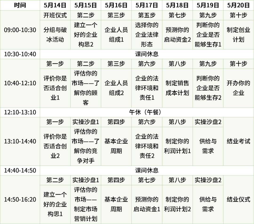 上海马兰花创业培训是人力资源社会保障部门按照政府激励引导、社会广泛参与、劳动者自主选择的原则,针对本市有创业能力提升意愿和培训需求的各类劳动者开展不同阶段的创业培训,包括以国际劳工组织SIYB(创办和改善你的企业)课程为基础的标准课程以及本市聚焦特定行业和重点人群开发的精品课程,通过激发创业意识、提高创业能力稳定企业经营,为劳动者提供创业培训和指导,实现就业倍增效应。培训采取集中授课、小班互动式教学。培训结束后根据参训学员情况提供实践活动等后续跟踪服务。 本次上海马兰花创业培训普陀SYB培训班报名现已正式启动,各位想要参与的小伙伴们快快准备起来,抓紧报名啦! 课程概述 本次培训课程不收取费用,为学员提供与时俱进的创新创业知识,帮助学员培养创业意识,掌握创业技能,增强小微企业抗风险能力。 学员筛选标准: 1、已经创办自己的企业; 2、有能力和资源创办自己的企业,并且已有初步可行的创业想法。 *满足上述任一条件并通过面试方可入学 获得结业证书的标准: 1、满足考勤要求; 2、完成创业计划书并上传系统。 *经过评估合格后方可获得结业证书 课程安排 点击查看大图,具体安排以实际情况为准 课程信息 培训时间 5月14日至5月20日 9:00-16:30 活动地址 上海市普陀区 报名方式 报名时间 即日起至2026年5月6日 报名方式 填写报名表并发送至邮箱 3353268316@qq.com 点击文末“阅读原文”,获取报名表 咨询电话 021-66118901