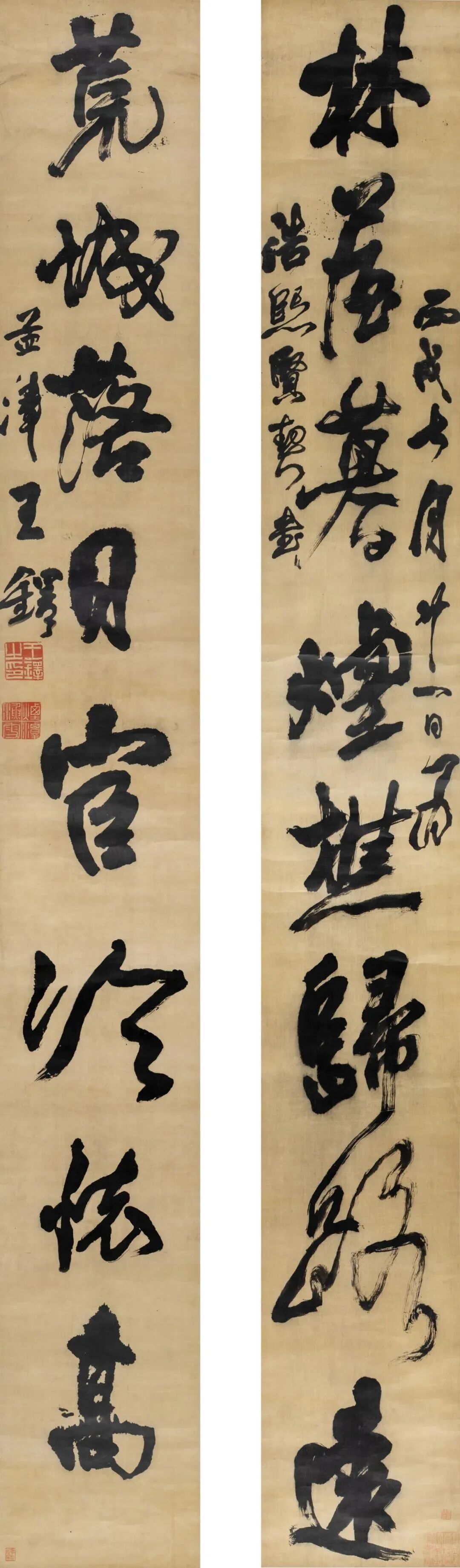 明 王铎 为浩熙贤契书八言联 纵302厘米 横38厘米 绫本水墨
