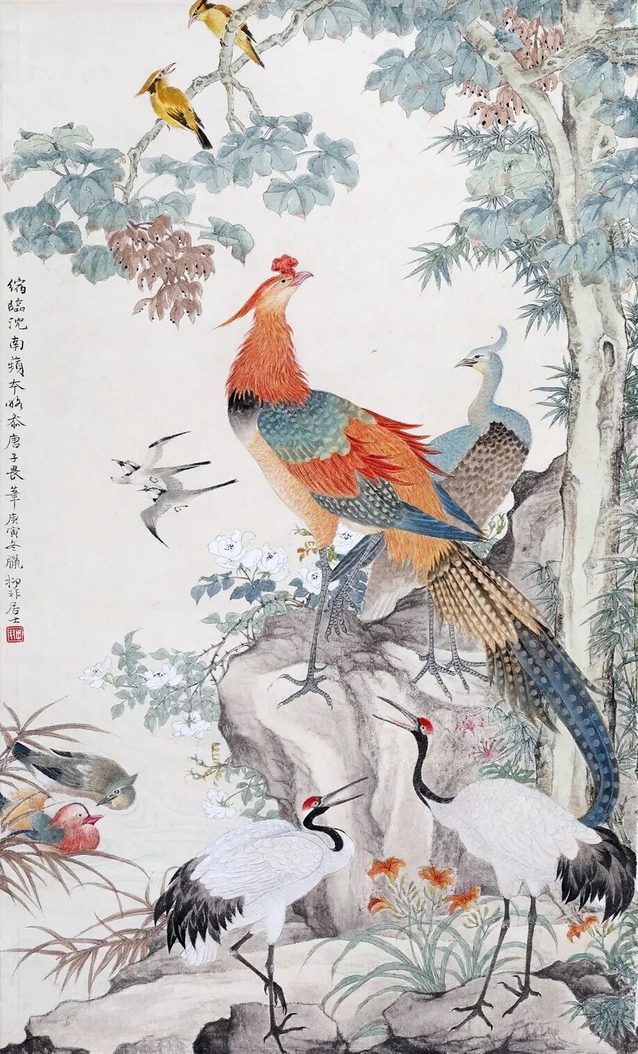 清 任伯年 天竹锦鸡图 纵232厘米 横48厘米 纸本设色
