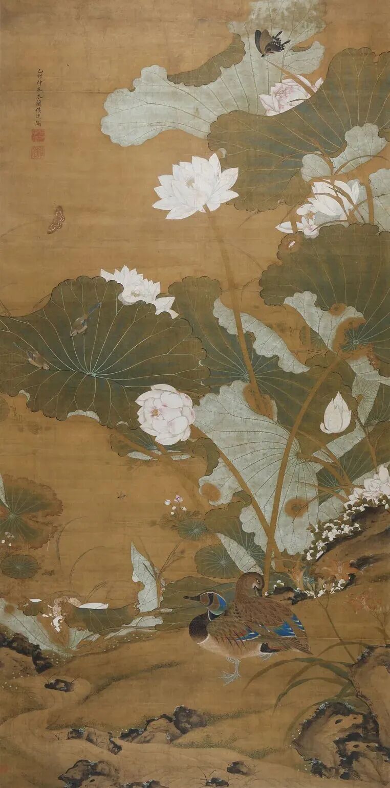 清 侯远 荷花水禽图 纵194厘米 横93厘米 绢本设色
