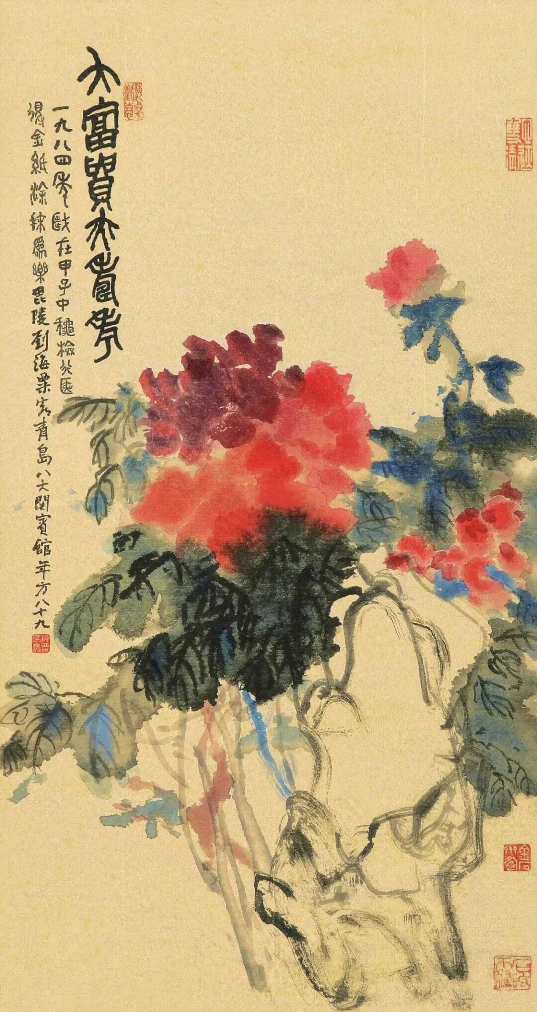 木版水印 刘海粟金笺牡丹图 纵89厘米 横48厘米 金笺设色
