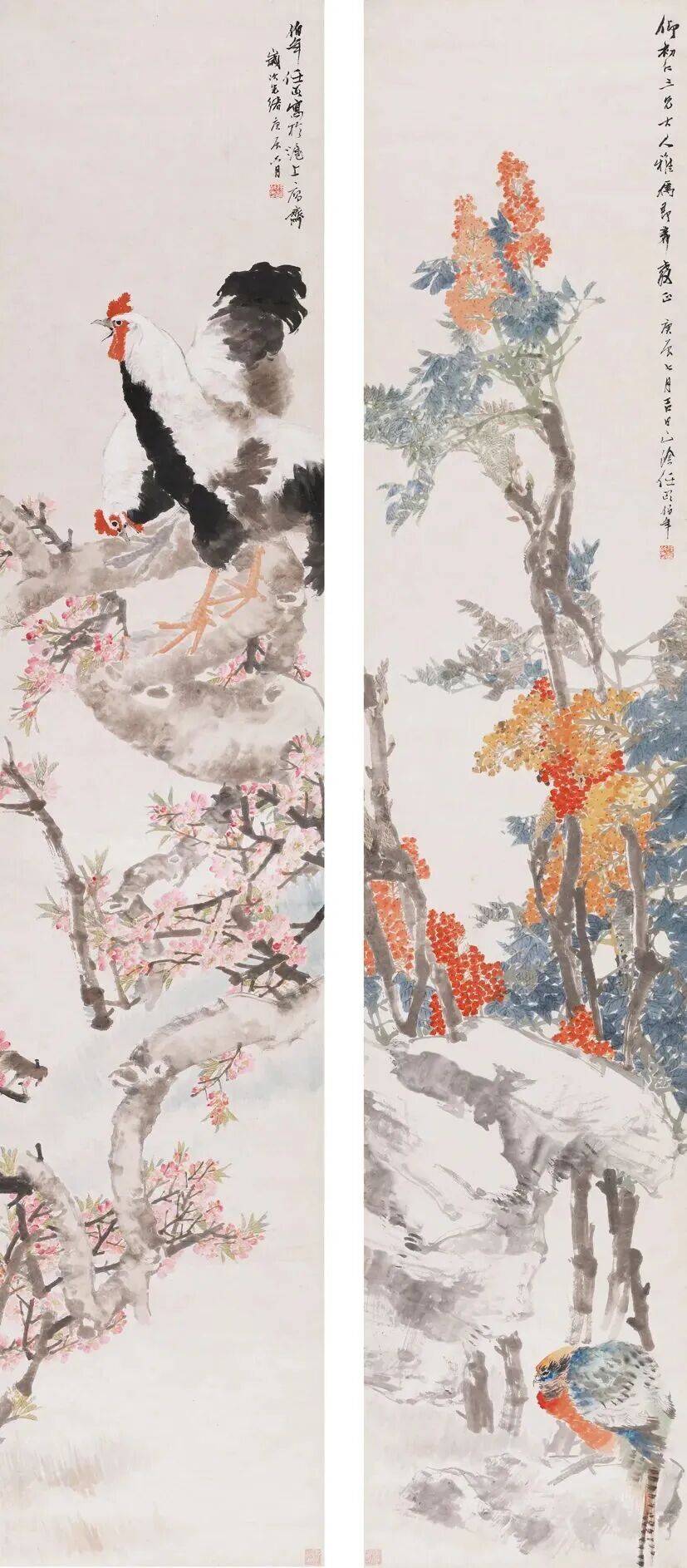 清 任伯年 桃花双鸡图 纵232厘米 横48厘米 纸本设色