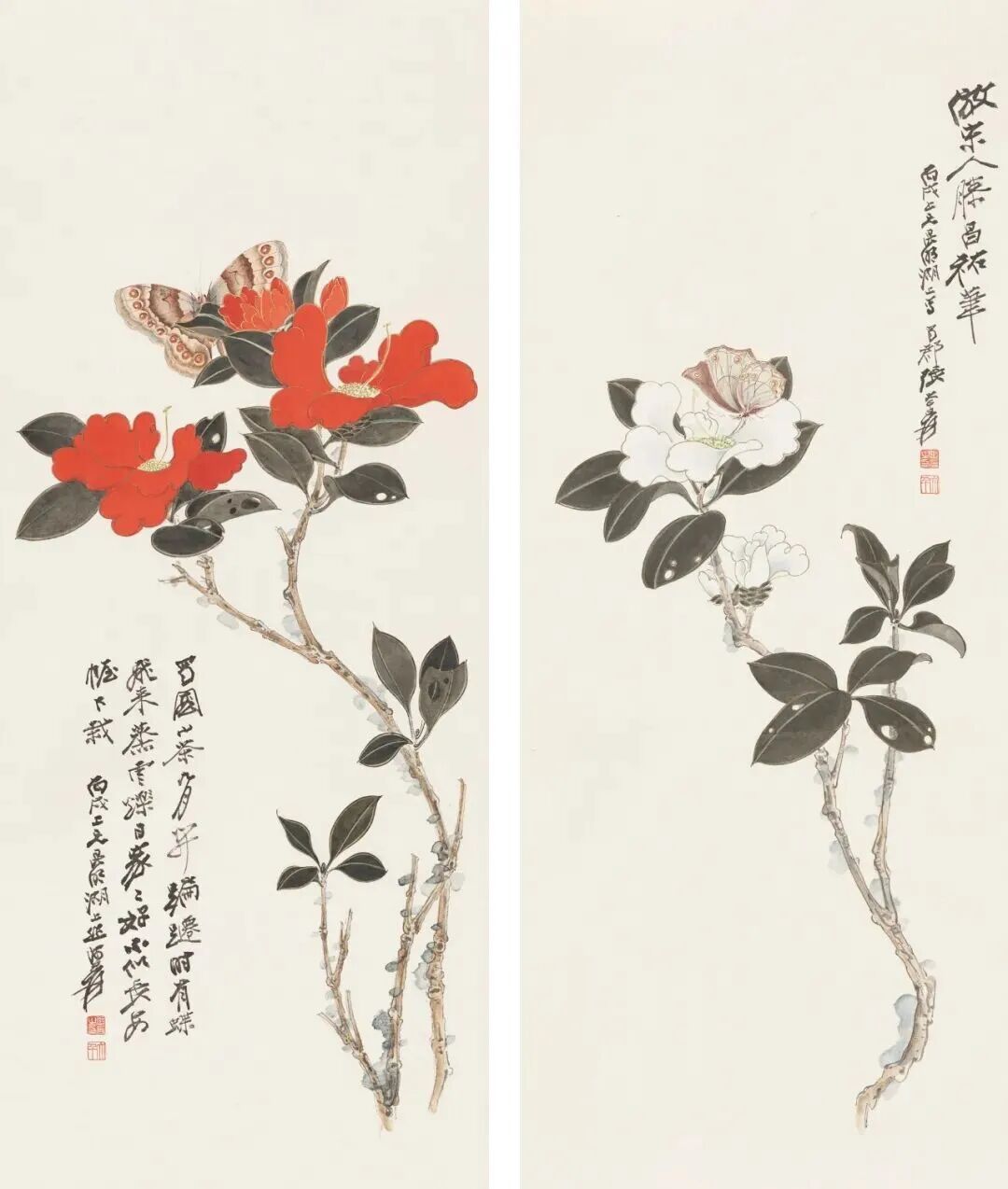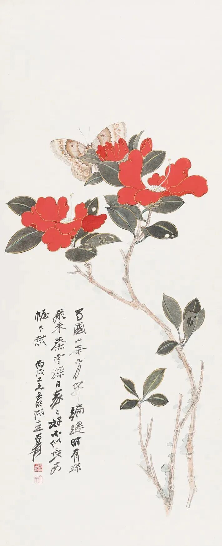 张大千 红山茶 纵96厘米 横39厘米 纸本设色