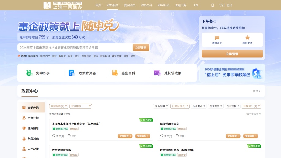 优化惠企政策全流程服务。在“一网通办”“随申兑”惠企政策精准服务专区,上线9条惠企政策、11个服务项目,涵盖水费减免、资金扶持、专项补贴等领域,新增6项政策实现“免申即享”——2025年度非居民用水超定额累进加价水费免收、污水处理费免征等,无需企业申请,系统自动匹配、自动兑现,并实时推送,推进政策红利精准直达市场主体,实现了从“高效办”到“无感享”的转变。