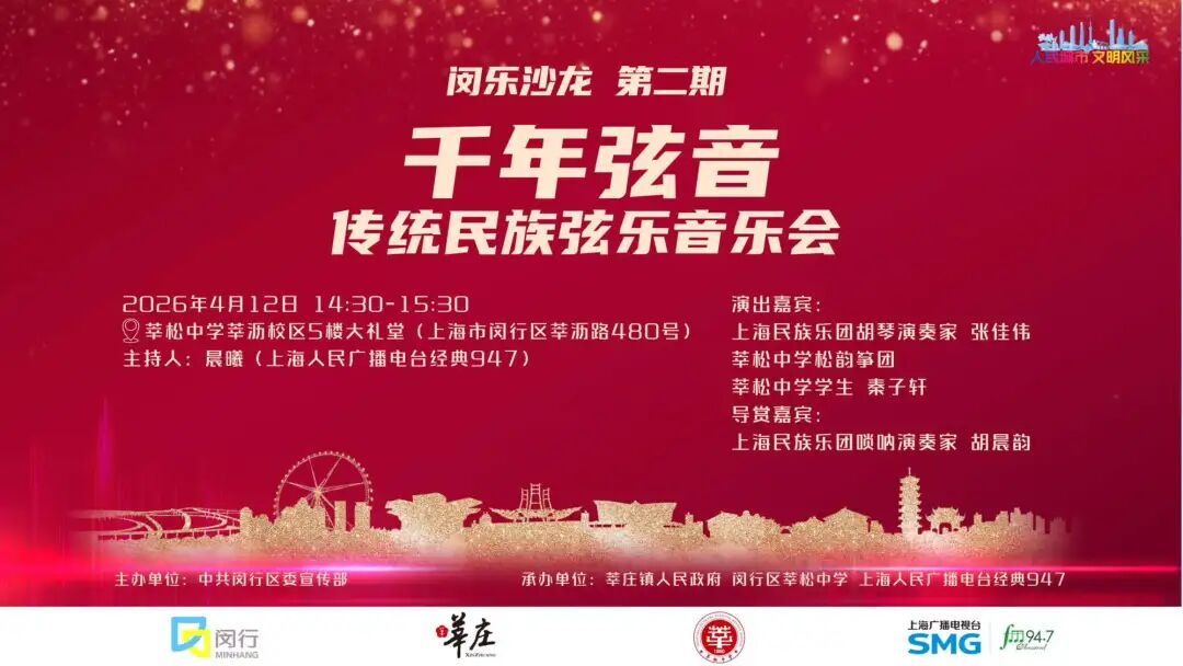 2026年4月12日下午,“闵乐沙龙”将走进莘松中学,上演“千年弦音——传统民族弦乐音乐会”,带你感受中华弦乐器的深厚底蕴与动人魅力!