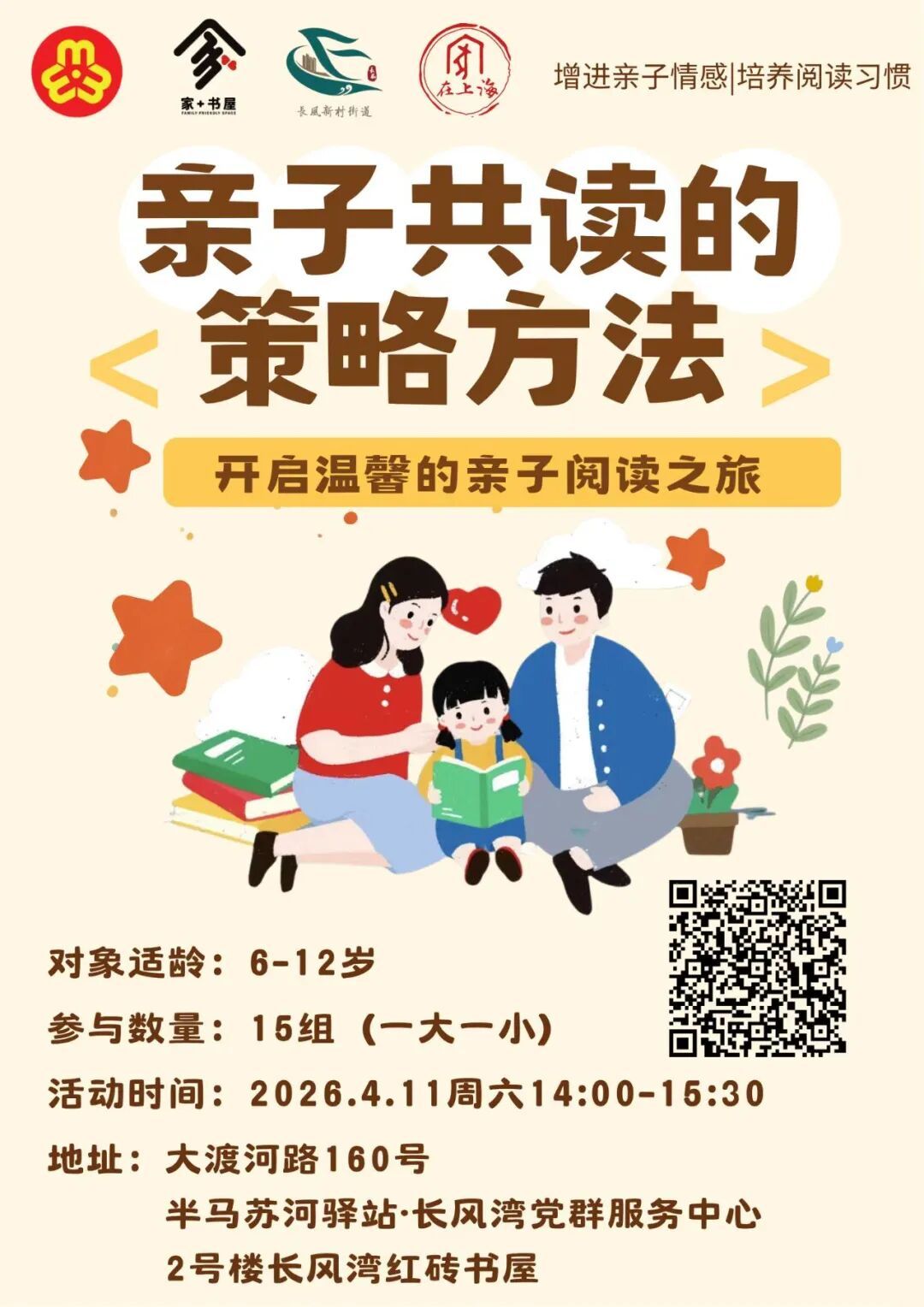 活动一:有效的亲子共读策略 妈妈,我不想看书。 爸爸,这本书好无聊。 如果你也遇到过类似场景,别急,不是你的孩子不爱读书,可能是他还没有养成阅读习惯或者你们还没找到“一起读”的正确节奏。 为什么读 活动将和各位家长共同探讨为什么要和孩子一起读书,明确根本目的。 怎么读 将从阅读环境、时间、共读技巧等多方面寻找适合和孩子共读的策略方法,走出共读误区。 读什么 活动将围绕如何选书、不同年龄段读什么书给出建议。 半马苏河驿站·长风湾党群服务中心2号楼长风湾红砖书屋(大渡河路160号) 2026年4月11日,周六14:00-15:30 本活动为上海市为民办实事“家+书屋”主题活动,不收取任何费用。活动有人员资格限制,敬请遵守。公益资源有限,请珍惜参与机会。 扫描“二维码”登记报名信息,名额有限,先到先得,额满为止。 *报名后如需修改信息或临时取消 请重新扫码填写/取消 王老师 13663676235(微信)