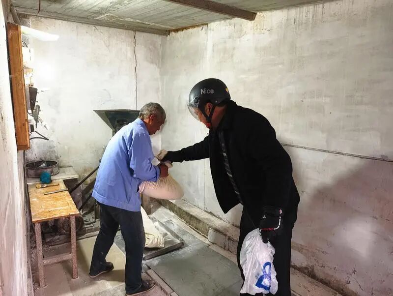 走进厂里,朱师傅正忙着接待前来轧粉的村民。附近村民丁大叔拎着一袋米走了进来,称重、交米、排队,一切都显得熟门熟路。
