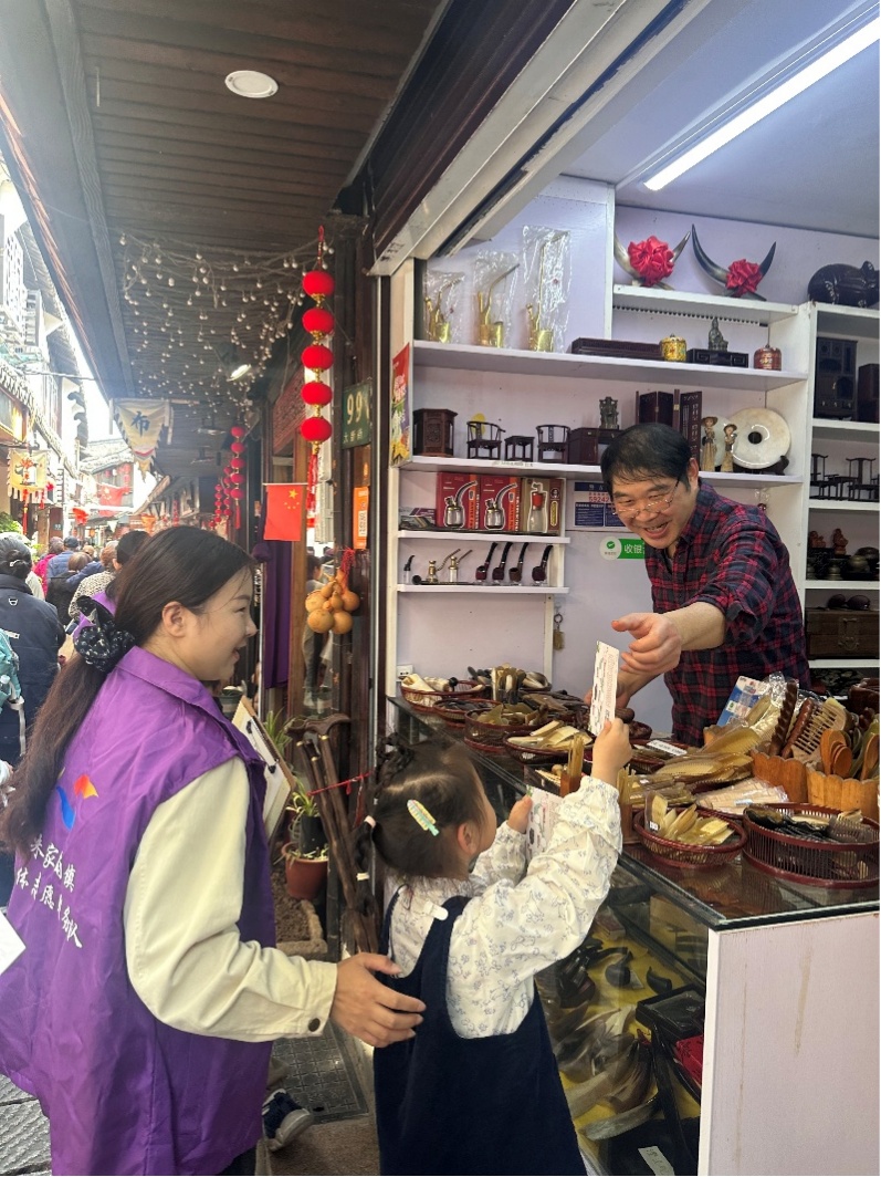 如果说绘画是静态的观察,那么“悦游角里·商户打卡”则是一场动态的探索。活动当天,朱家角历史文化展厅、角里工艺屋、东篱南山饰品店、永丰茶楼以及具有百年历史的大清邮局,化身为五个“文化宝藏点”。市民游客手持免费领取的集章卡,循着老街脉络逐一探访,在“角里红色·人文商铺”感受历史沉淀,在“角里非遗商铺”触摸匠心传承,最后在大清邮局盖下纪念邮戳,兑换特色文创。这种“行走式”体验将红色文化、非遗技艺、水乡文明与旅游观光完美融合,让市民在走走停停间与朱家角进行了一场深度的文化对话。“边逛古镇边集章,孩子特别兴奋,每找到一个打卡点都像发现了新大陆。这种形式让文化不再是书本上的文字,而是可触可感的体验。”带着孩子参与活动的张女士兴奋地说道。