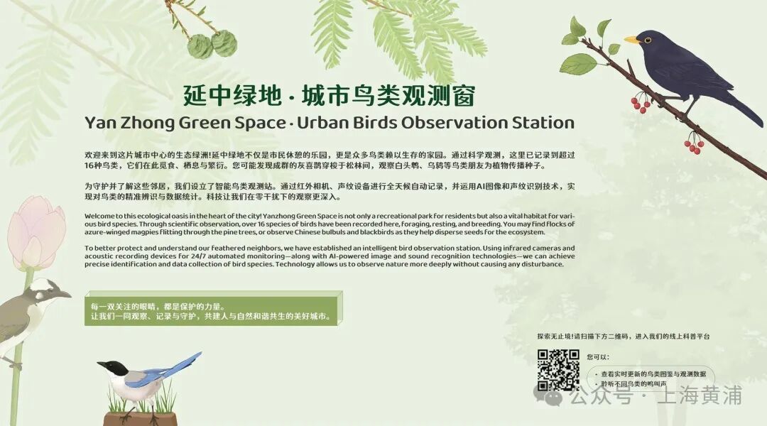 此外,“广场公园(黄浦段)生物多样性监测速览”线上H5互动页面也同步上线。市民扫描绿地内二维码即可一键进入,随时随地“掌上观野”。