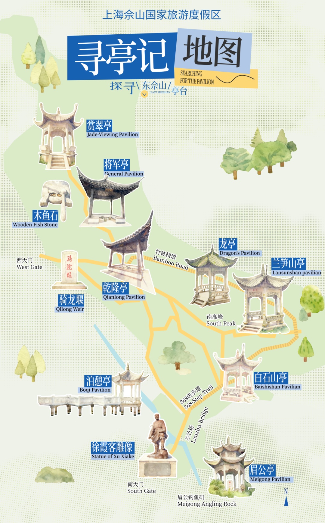 “寻亭记”活动的灵感,源于明代旅行家徐霞客与文学家、隐居佘山的陈继儒(眉公)。活动邀请亲子家庭走进东佘山,踏着先贤的足迹,探寻山中亭台的故事,在山水间扫码集卡,解锁数字成就,完成一场古今交织的人文漫步。