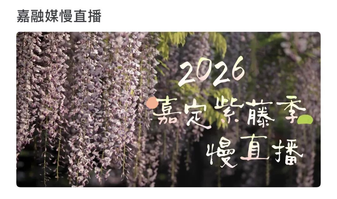 玩法:足不出户,打开“上海嘉定”APP或“嘉视频JCMC”,就能直达嘉定紫藤公园的【慢直播】现场!镜头24小时守候,为你实时捕捉花况的每一个微妙变化。从第一朵花苞探头,到满架繁花似锦,每一秒的美,都不会错过。