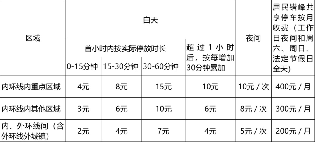根据市价格主管部门会同市财政部门核定的本市智慧道路停车场收费标准和计费规定(如下表),本次新增的7处内环线内其他区域,4处内、外环线间的收费标准和计费规定执行如下:
