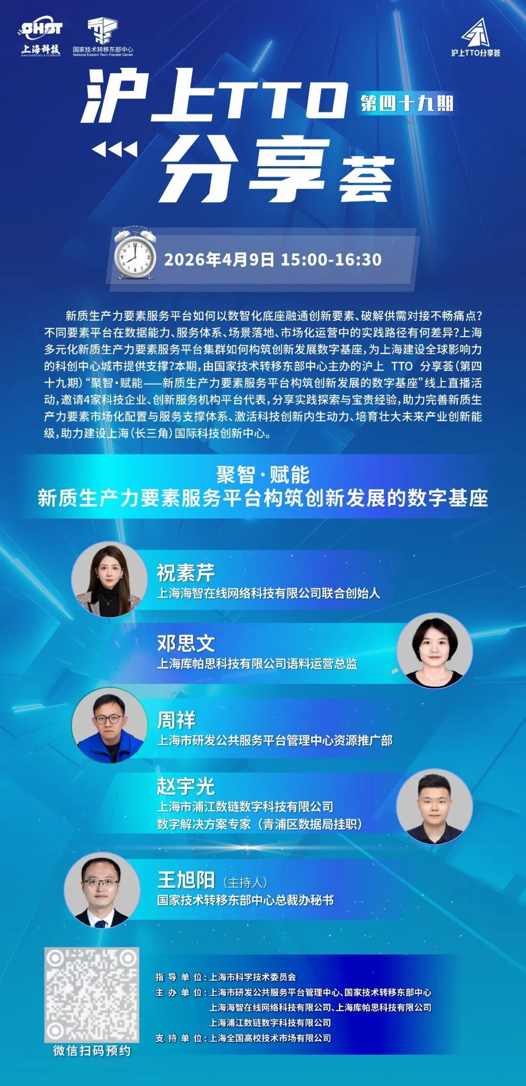 新质生产力要素服务平台如何以数智化底座融通创新要素、破解供需对接不畅痛点?不同要素平台在数据能力、服务体系、场景落地、市场化运营中的实践路径有何差异?上海多元化新质生产力要素服务平台集群如何构筑创新发展数字基座,为上海建设全球影响力的科创中心城市提供支撑?4月9日15:00,国家技术转移东部中心将主办沪上 TTO 分享荟(第四十九期)“聚智・赋能——新质生产力要素服务平台构筑创新发展的数字基座”线上直播活动,邀请4家科技企业、创新服务机构平台代表,分享实践探索与宝贵经验,助力完善新质生产力要素市场化配置与服务支撑体系、激活科技创新内生动力、培育壮大未来产业创新能级,助力建设上海(长三角)国际科技创新中心。