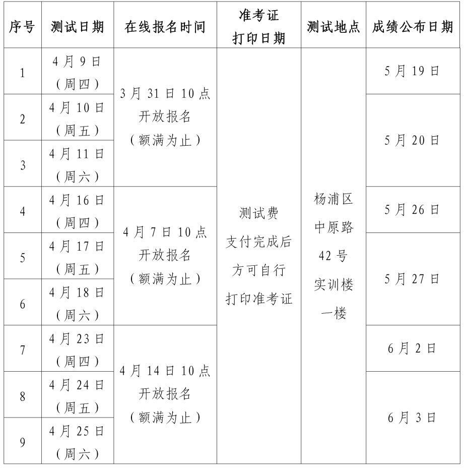 2026年4月普通话水平测试面向社会考生测试即将举行,报名及测试安排如下: 考生提交报名信息后,个人信息及测试日期均不可更改,具体报到时间请以准考证为准。 重要提醒 1.如因不可抗力,调整测试时间或取消测试,将及时通知考生,请考生关注。 2.考生在考前务必再次检查是否携带好本人纸质准考证、二代身份证原件。(二者缺一不可,否则无法参加考试) 3.考生应按准考证上规定的时间报到。迟到30分钟以上者,取消测试资格,测试费不予退还。 4.测试当天须采集考生照片作为证书照片,请考生注意着装。 5.测试期间,考生在测试室必须关闭手机等通信工具,否则按违纪处理。 6.在测试过程中,考生应遵守考场纪律,服从考务人员安排,并按国家普通话水平智能测试系统的提示进行操作和测试。 7.考生不得请他人代考,也不得替他人测试,一经发现,取消本次测试成绩及一年内的测试资格,并向相关单位通报情况,提请其所在单位给予处理。 8.考生可于完成测试25个工作日之后通过“国家政务服务平台”微信小程序查询测试成绩并添加普通话水平测试等级证书电子证书。国家普通话水平测试网(https://www.cltt.org)和国家普通话水平测试在线报名系统(http://bm.pthceshi.cn)亦可查询测试成绩。选择需要快递纸质证书的考生,证书发放日期为自成绩查询起算的25个工作日后。 9.测试结束后准考证请妥善保管,成绩查询需同时输入姓名、证件号、准考证号。准考证号可在国家普通话水平测试在线报名系统(http://bm.pthceshi.cn),选择“上海”入口完成登录后在“帮助中心”自助查询。 10.测试资料为语文出版社出版的《普通话水平测试应试指导》,可按需自行购买。 11.如出现异常情况,考生须听从考点安排,积极配合。 详情点击“阅读原文”了解