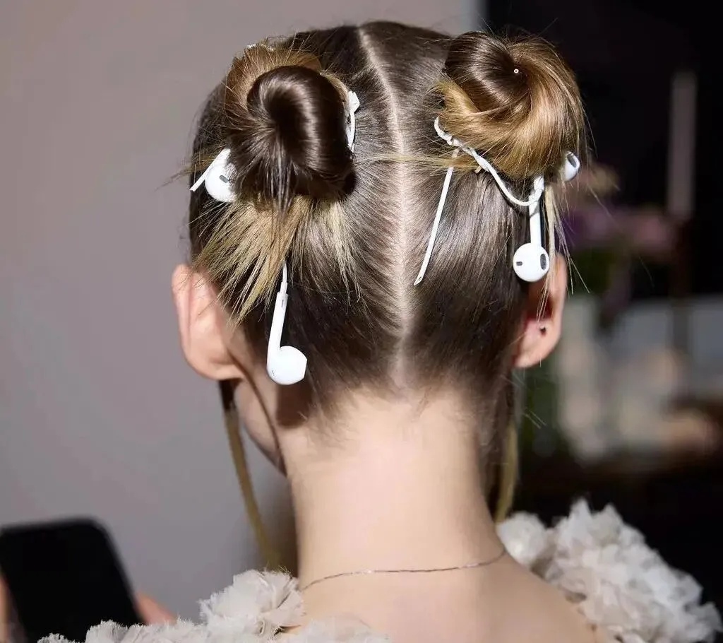 直接把有线耳机缠进发髻,成了全场焦点。
