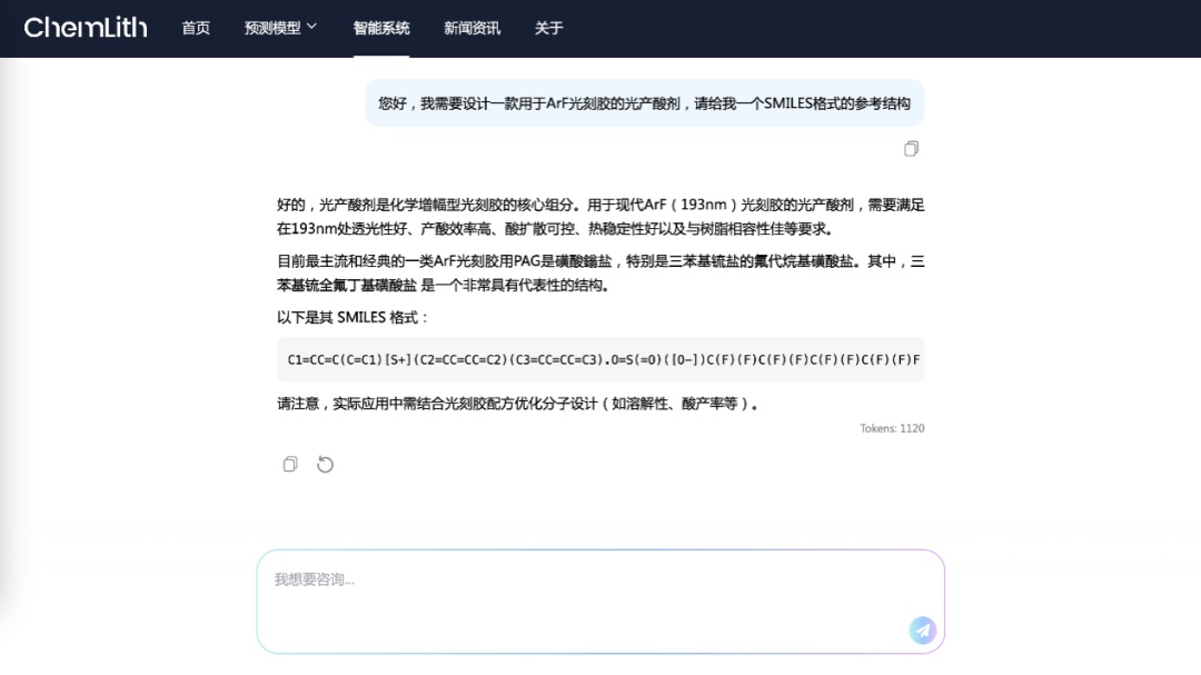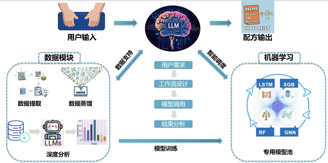 该智能系统可以实现从用户需求解析、专业知识问答、分子结构生成、分子性质预测到配方性能预测的全流程服务。研发人员用自然语言提出需求,系统会自动调用相关模型并进行分析,给出候选分子结构、推荐配方和预测性能,有助于打破光刻胶设计的知识壁垒。