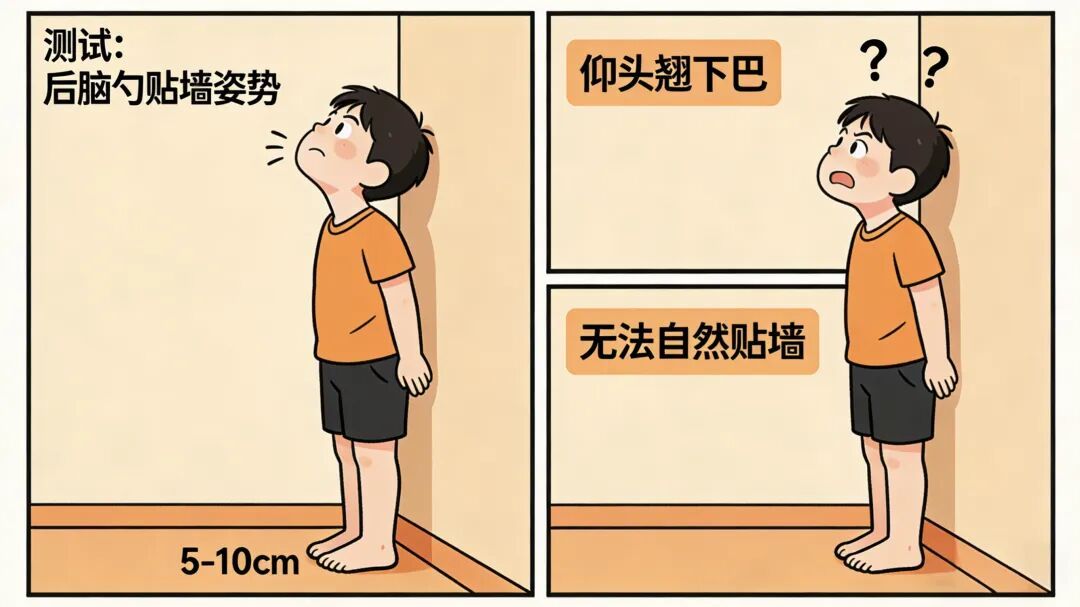 靠墙站立(脚跟离墙约5-10cm),后脑勺是否难以自然贴墙?或贴墙必须“仰头翘下巴”?——提示胸椎伸展受限/头颈前倾明显。