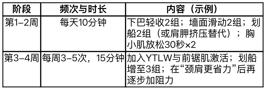 如果存在明显体态问题,应先恢复活动度与控制能力,再谈加阻力训练。建议用手机侧面拍照自评: