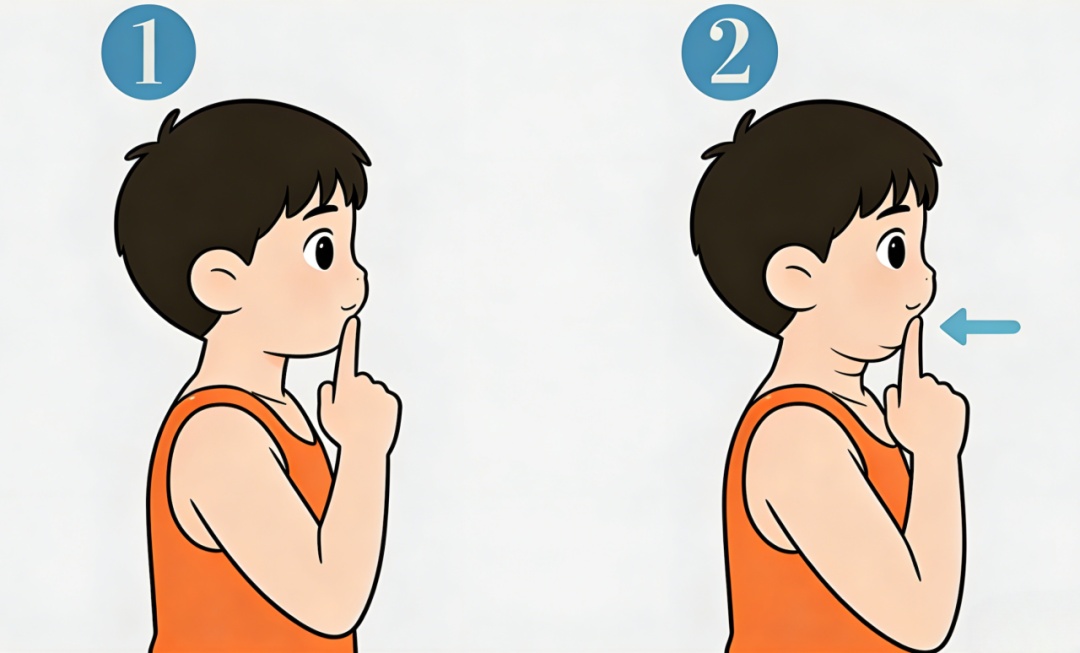 做法:想象把下巴“水平往后收”,像把后颈拉长;不