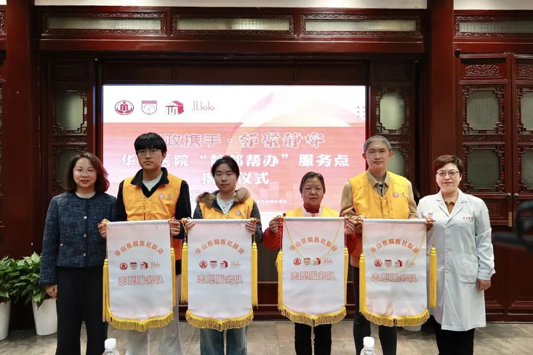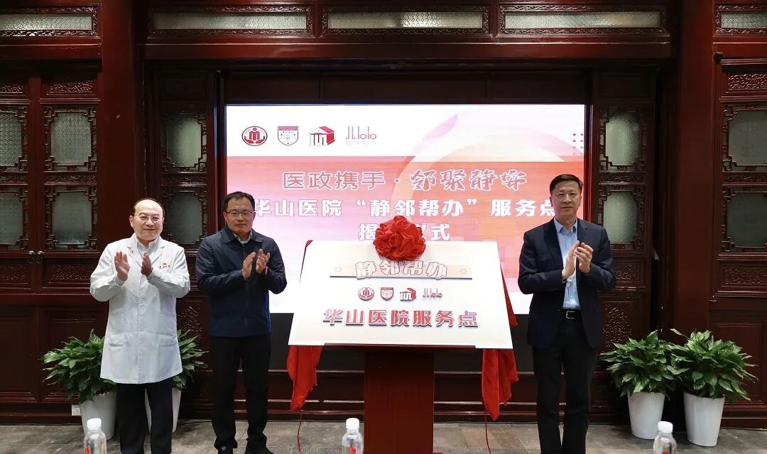 赵明、傅俊、郑宁共同为 “静邻帮办” 华山医院服务点揭牌,这标志着华山医院便民服务再次升级。