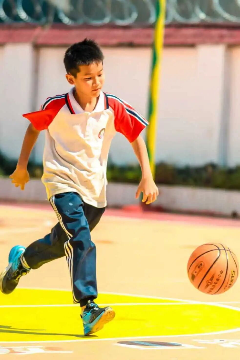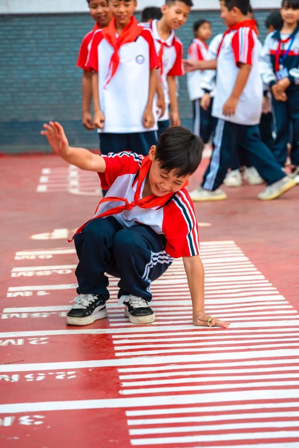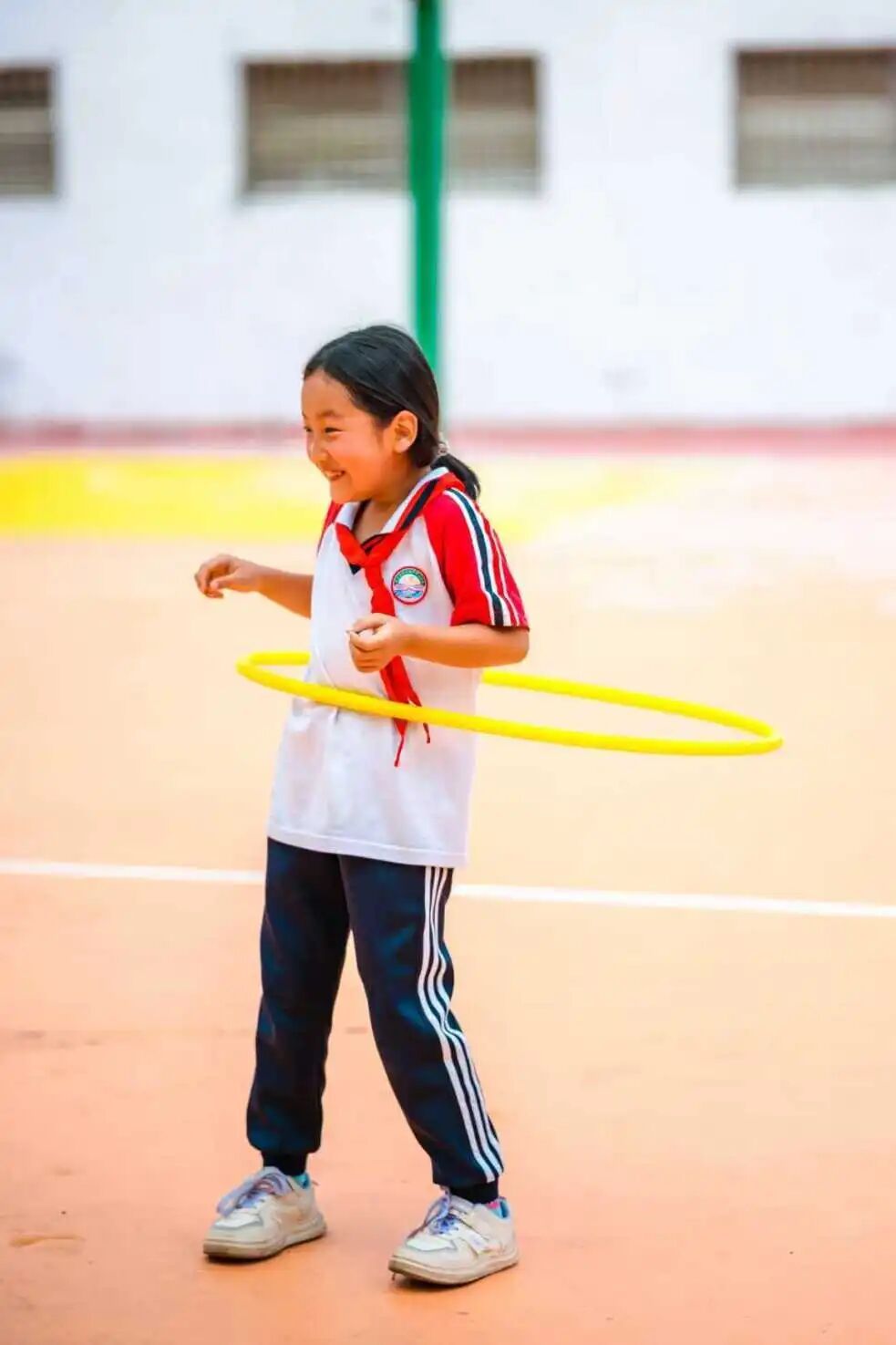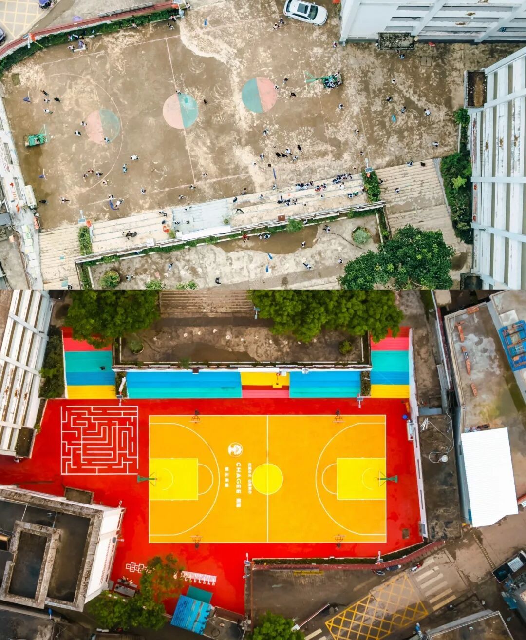 经过改造,这片崭新的运动空间功能更多元,装点上了红、黄、橙等多种明亮的色彩,成为了校园里最亮眼的一抹风景。中央是一座标准篮球场,兼作羽毛球场,满足日常体育教学与课后运动需求;一侧规划了跳远区、跳房子与地面迷宫游戏区,为孩子们提供丰富的课间活动选择;而环绕场地的七彩看台及台阶,则兼具休憩与观赛功能。