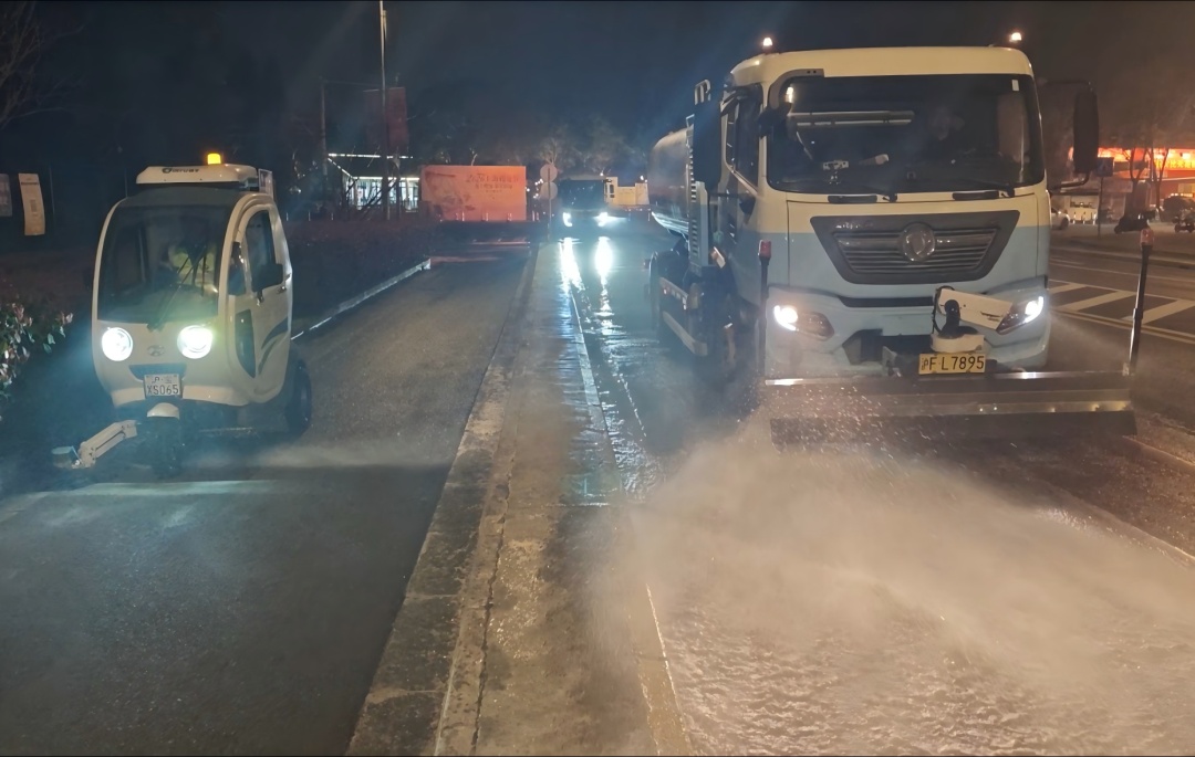 保洁过程中,联动大型机械与小型机械设备协同错峰作业,早上6点之前配置大型冲洗车、洗磨车,利用交通平峰窗口期,对公园周边主次干道实施双向精细化冲洗,完成开园前大面积、高效率的基础保洁覆盖。白天日常保洁阶段,合理安排小型机扫车实行弹性班次作业,重点对周边路边、沿边缝隙等大型机械难以触及的作业盲区进行全覆盖、高频次机扫,精准清除残留垃圾、浮尘,显著提升机械化保洁整体效率,形成“夜间大扫+日间精扫”的接力模式,确保开园前提前保障与开园后实时保障无缝衔接。