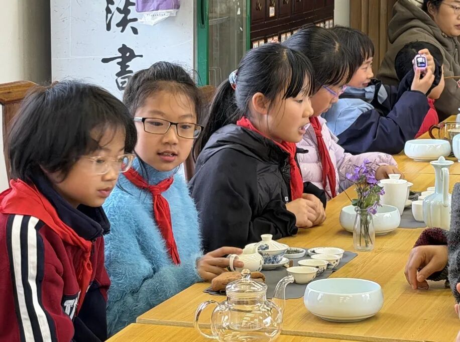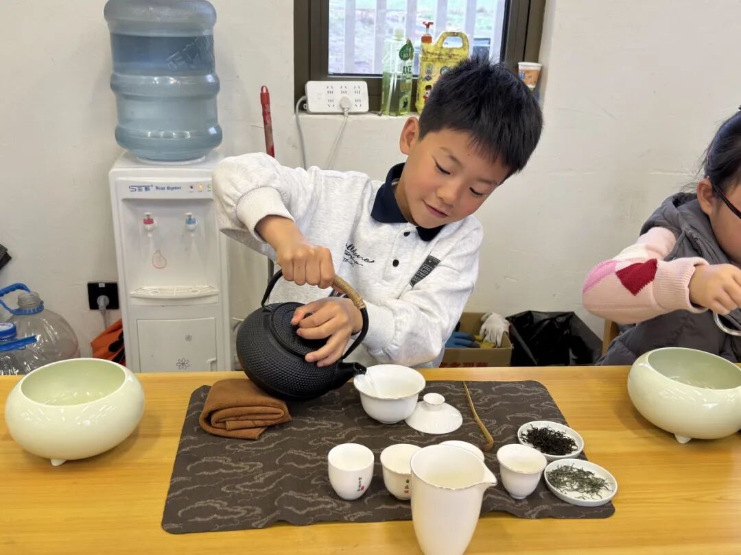 活动从茶的起源讲起,老师带着孩子们回到那片叶子最初的故事:神农尝百草,得荼而解之。茶从山林走入中国人的日常,从药用到饮用,从祭祀到待客,慢慢沉淀为“柴米油盐酱醋茶”里的生活底色,也成为“琴棋书画诗酒茶”中的精神寄托。清明时节,茶树历经一冬蛰伏,芽叶最为鲜嫩。老师告诉孩子们,古人讲究“明前茶,贵如金”,不只是因为稀少,更是因为这一杯春茶里,藏着中国人顺应天时、尊重自然的生活哲学。清明饮茶,不是风雅点缀,而是人与土地、与节气之间的一种默契。孩子们静静聆听着这份古老的智慧,谦和平宜的茶道精神也伴着茶香在心底深深扎根。