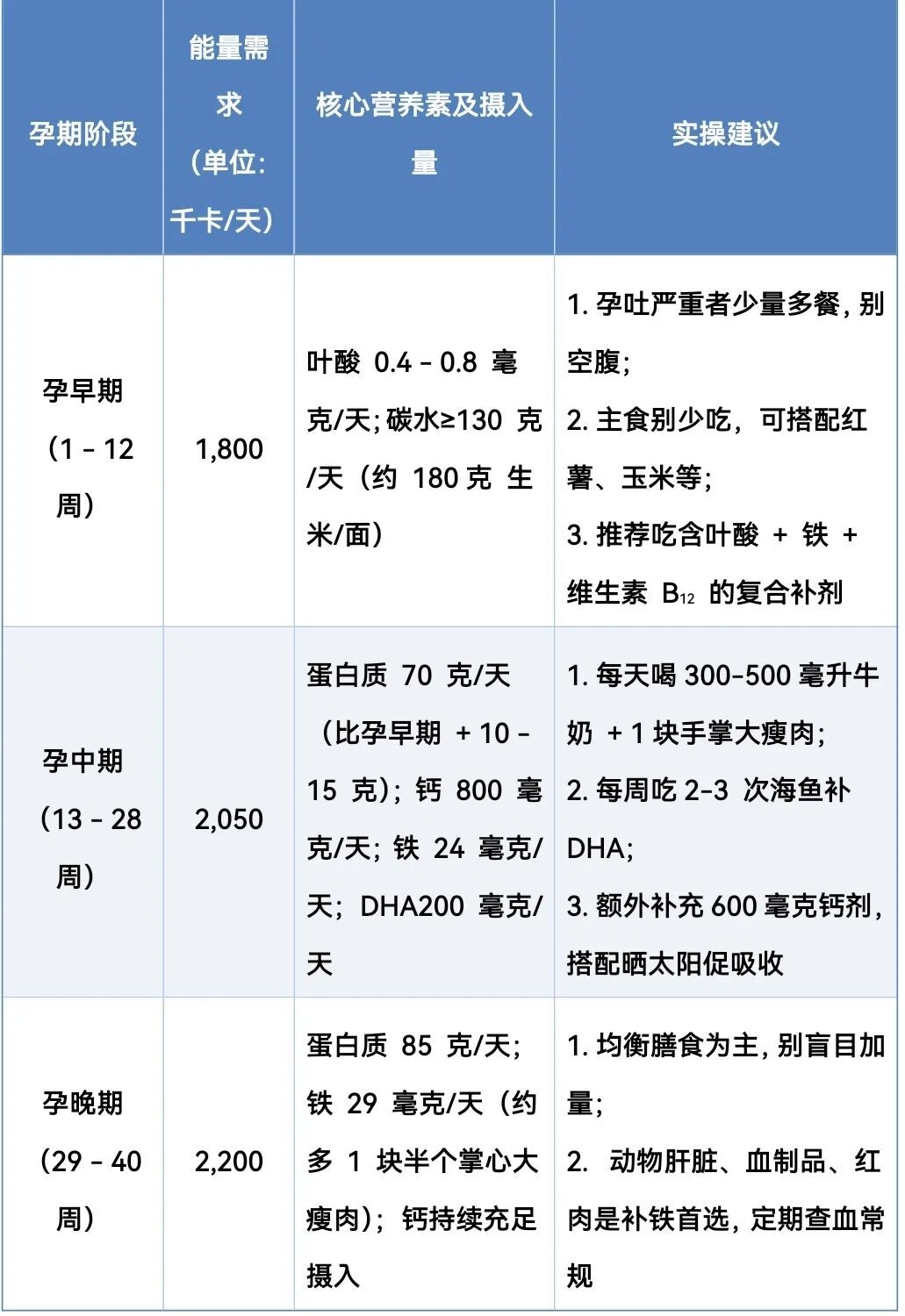 孕期各阶段营养需求及建议表