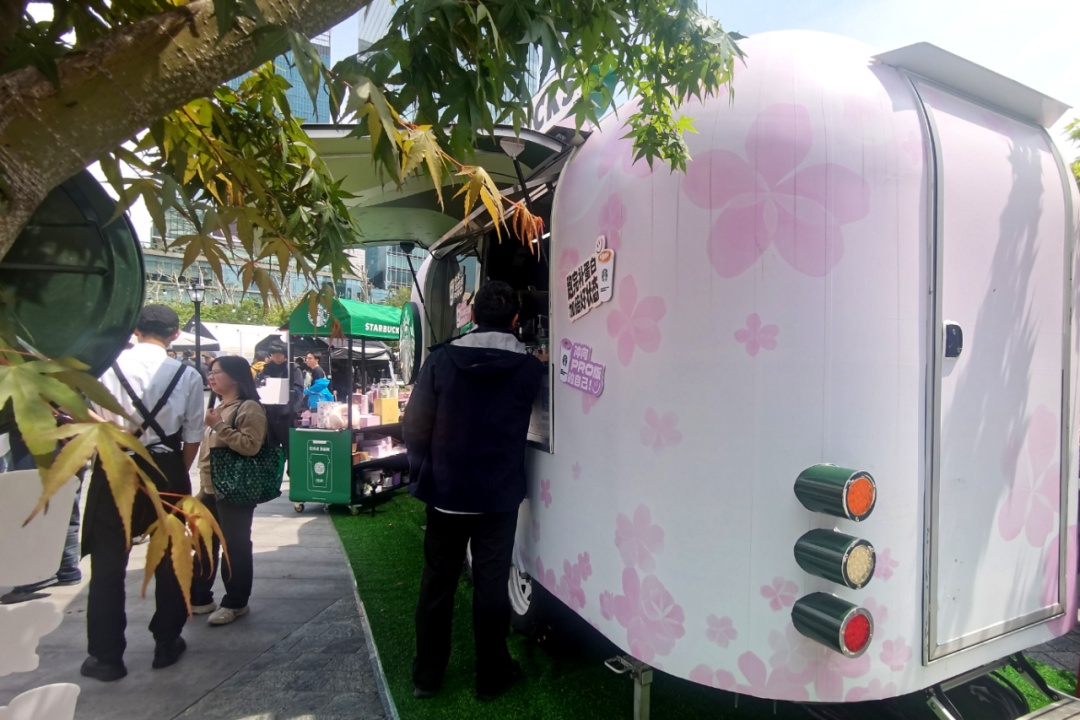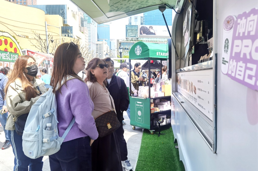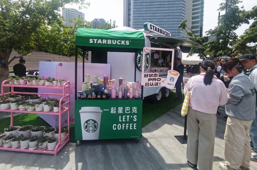 在位于丰盛里·静安寺广场的市集主会场,一辆粉色樱花装饰的星巴克移动咖啡车造型萌趣又春意盎然,格外惹人眼球。