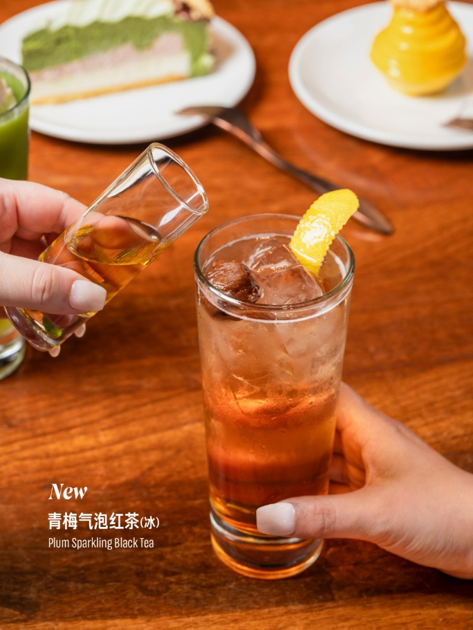 青梅气泡红茶以武夷山松山正山小种萃取茶底,融入沁爽青柠气泡水,再配以紫苏风味提升味蕾层次,再加入些许梅酒,梅酒入茶,口感回味无穷。