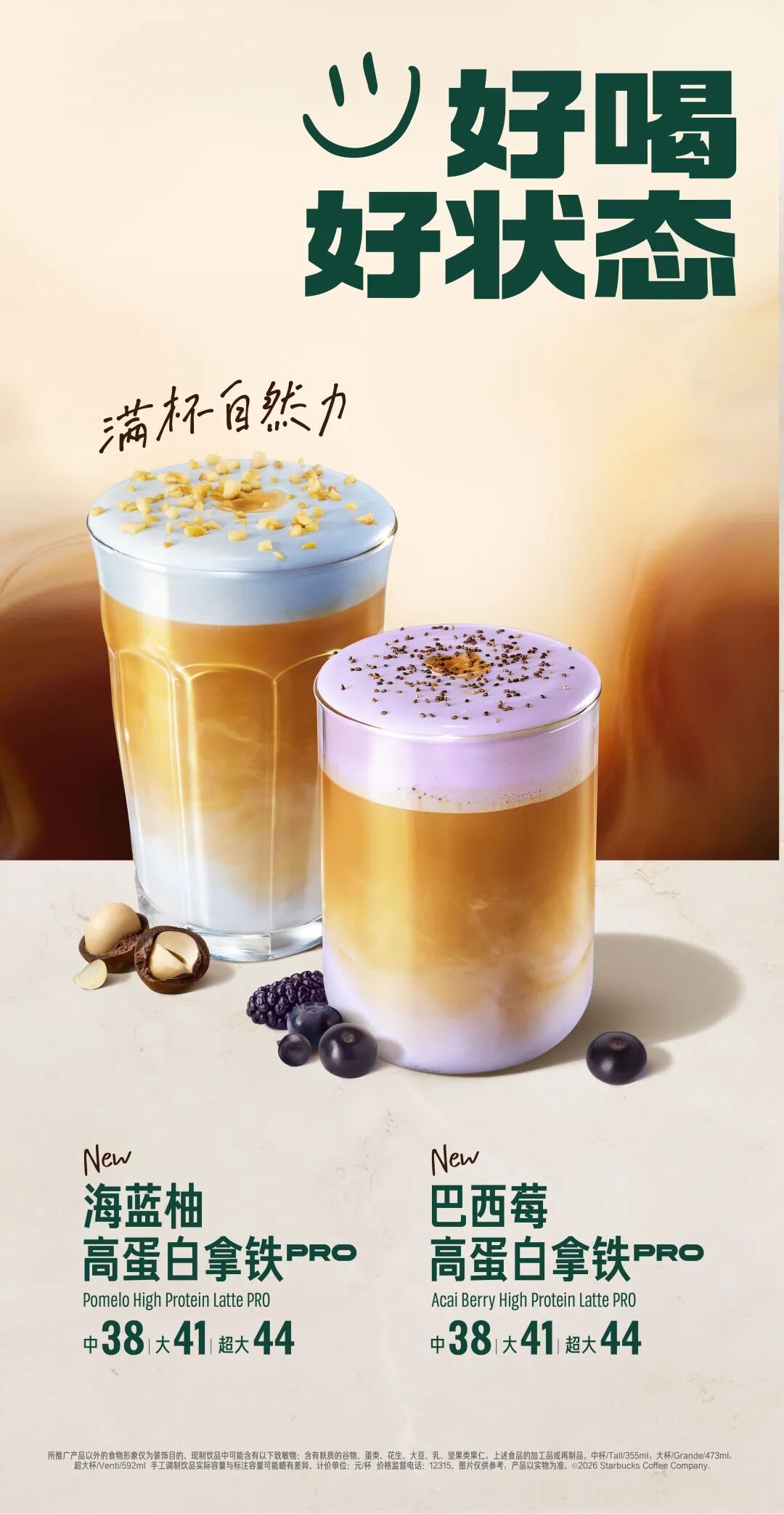 高蛋白拿铁PRO系列中的两款季节限定产品——巴西莓高蛋白拿铁PRO和海蓝柚高蛋白拿铁PRO都采用超元气食材与高蛋白牛奶进行搭配。