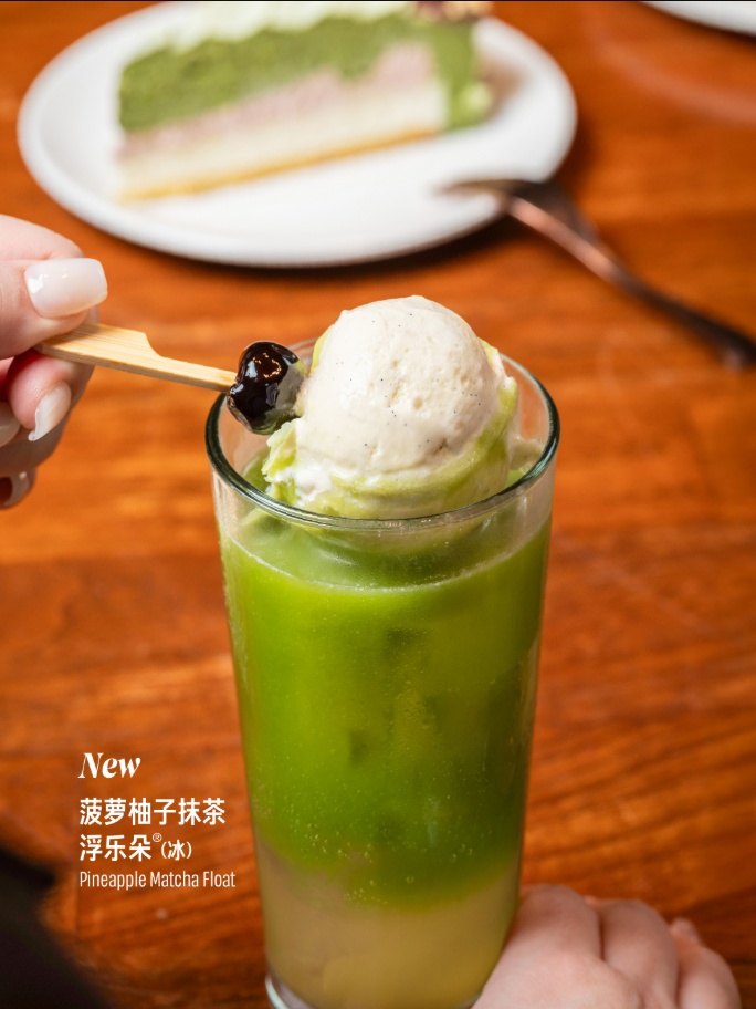 菠萝柚子抹茶浮乐朵将礼仪级抹茶融入香草风味冰淇淋,以活力苏打跃升口感,并以菠萝与柚子点亮味蕾,轻吮一口,茶香清澈,果香四溢,令人回味无穷。