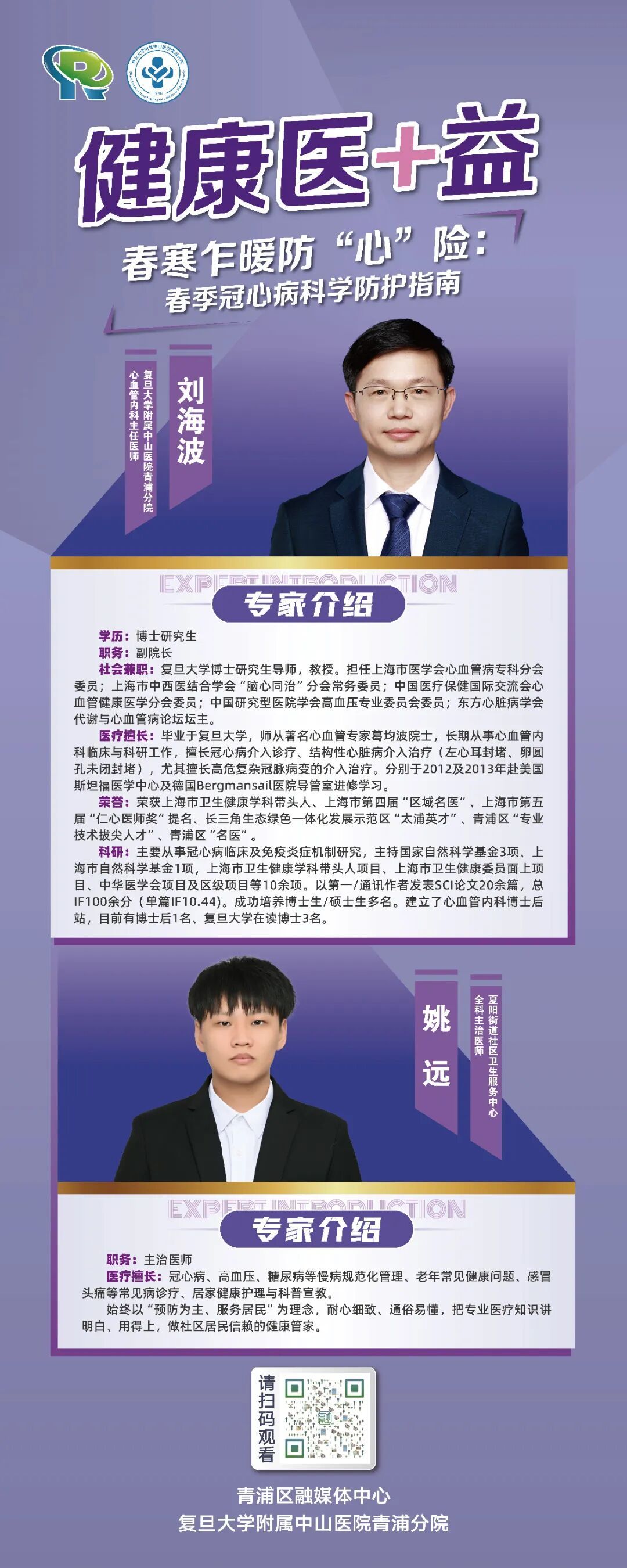 2026年4月9日(星期四)中午12:30-13:30,“健康医+益”科普直播活动走进青华社区,特邀复旦大学附属中山医院青浦分院副院长、心内科主任医师刘海波与夏阳街道社区卫生服务中心全科主治医师姚远,为居民带来春季冠心病科学防护专题讲座——《春寒乍暖防“心”险》。