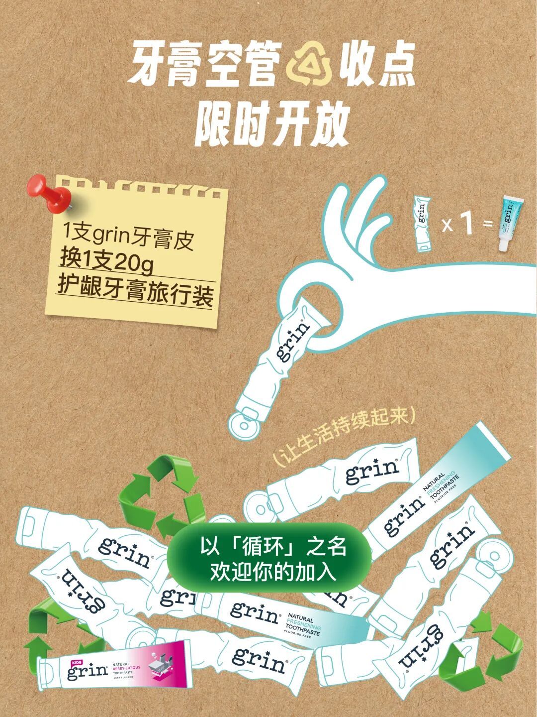 ,鼓励市民携带使用完的grin牙膏空管前来兑换新产品。据悉,自2017年启动“空管回收计划”以来,grin通过铝塑分离再生技术已累计回收超过百万支牙膏空管。