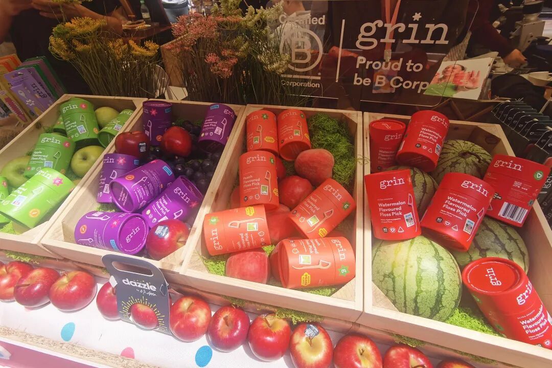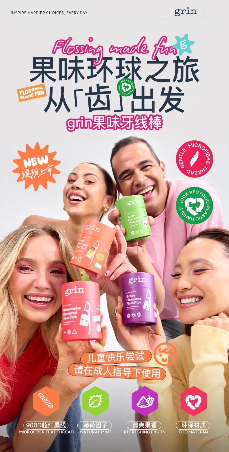 步入grin展区,“趣你的水果牙线棒”主题设计明快缤纷,呼应品牌轻松愉悦的护理理念。现场首发的水果味牙线棒不仅采用柔韧耐用的900D超纤PET加宽扁线材质,还变身带有四种“城市记忆限定香”的味觉邮票: