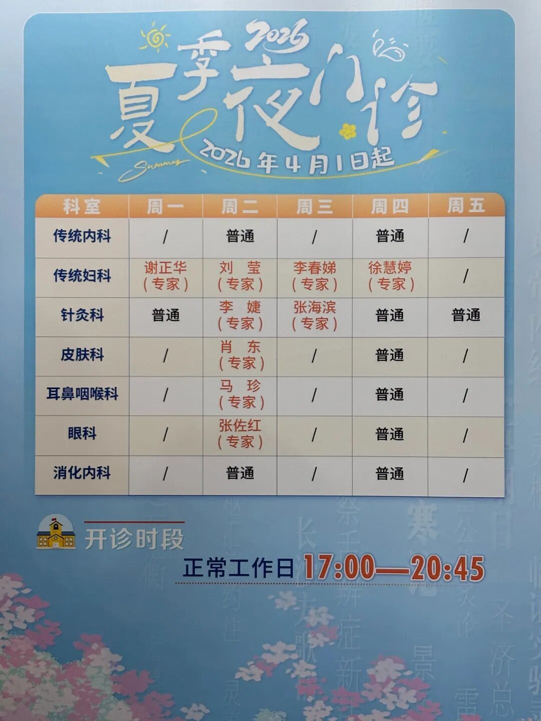 据悉,为保证夜门诊服务质量,医院召集了各科室知名专家和骨干医师轮流坐诊,覆盖内科、妇科、皮肤科、针灸科、耳鼻喉科、眼科、消化内科等专科领域,涵盖中医传统理疗如艾灸、穴位敷贴,以及西医专科诊疗、慢病随访、健康体检等项目。