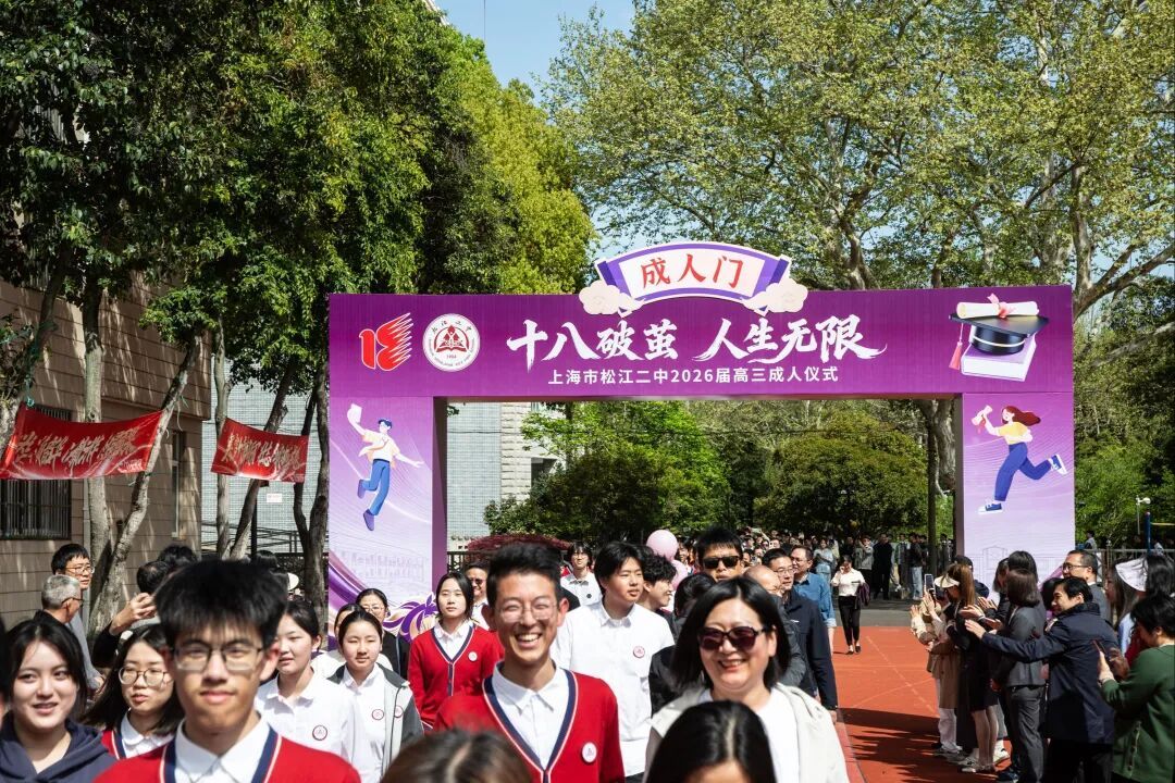仪式现场,梦幻的紫色调成人礼拱门稳稳地立在跑道上,鲜花和气球在人群中格外显眼。音乐响起,松江二中11个班、九峰高中4个班的学生依次列队走过成人门。