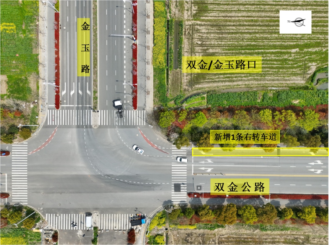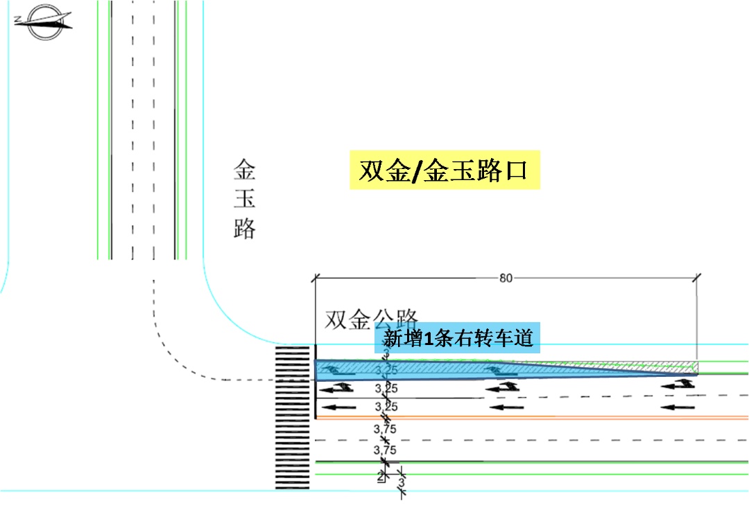 二是双金/金玉路口,增加1条南向东右转车道。详见下图: