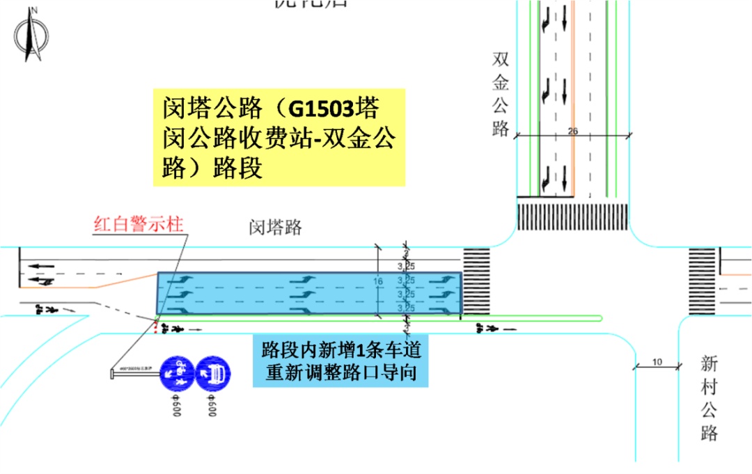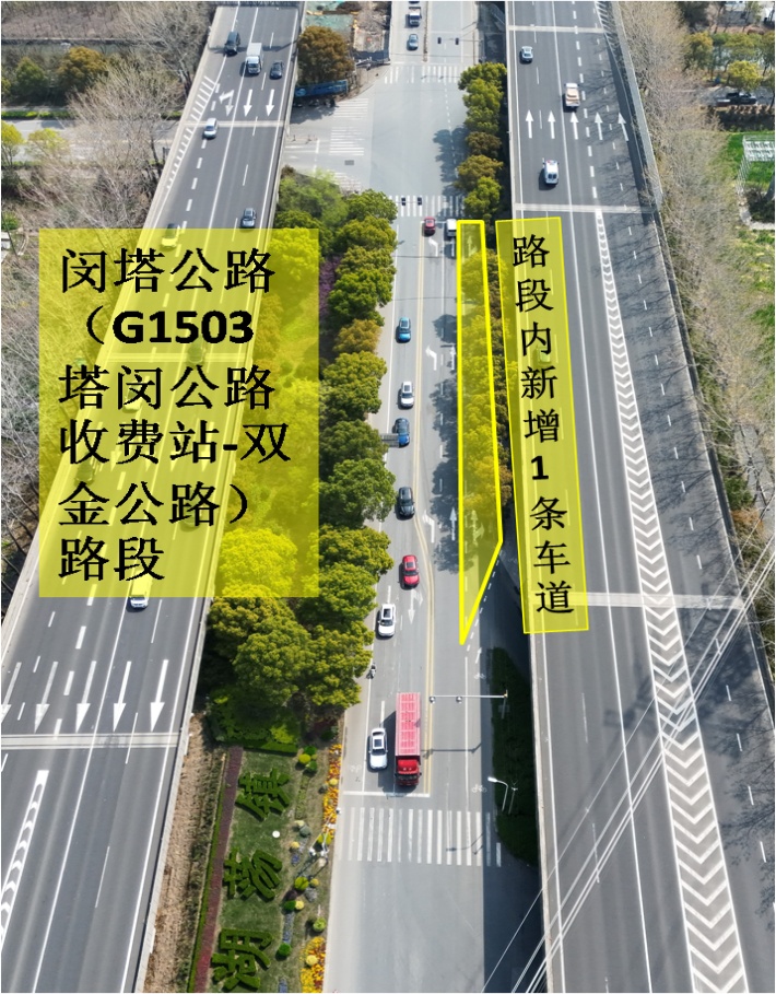 一是闵塔公路(G1503塔闵公路收费站-双金公路),西向东方向增加1条机动车道。详见下图: