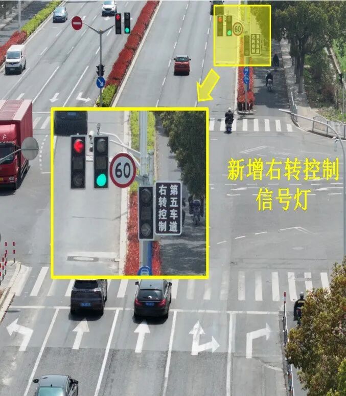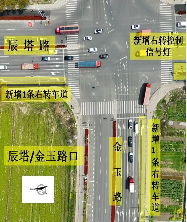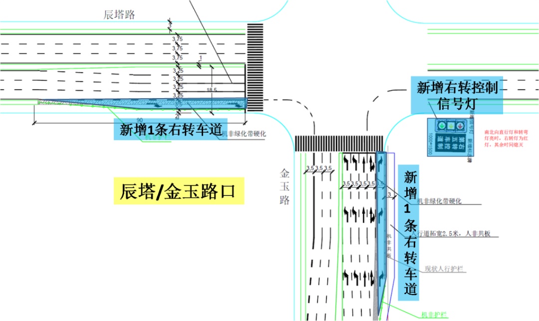 三是辰塔/金玉路口,西向南、北向西各增加1条右转车道,同时车道调整后,为消除2条右转车道机动车与路口南北方向直行、左转非机动车之间的事故隐患,路口同步设置北向西右转控制信号灯,在南北方向直行、左转信号灯绿灯时,控制北侧5号右转车道车辆。详见下图:
