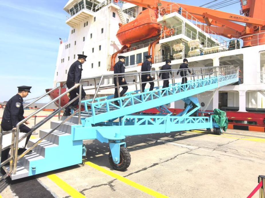 外高桥边检站民警宋巍介绍:外高桥边检站多次保障极地科考船高效通关,总结提炼了“前置信息梳理、合理规划通道、暖心服务引导、靠前办理手续”全流程通关保障模式,该模式省去了科考队员、船员、代理人员在窗口、码头之间来回奔波的麻烦,大幅提高了通关效率、优化了通关体验。
