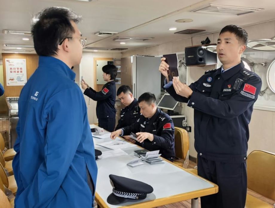 “雪龙”号靠泊后,民警第一时间登轮,在船上设立前置查验点,为“雪龙”号100余名科考队员和船员高效办理了入境边检查验手续。