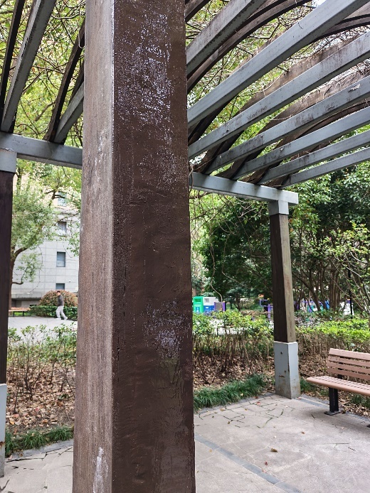 在专项排查中,物业服务团队发现小区中心花园凉亭木质立柱出现明显白蚁蛀蚀痕迹。该凉亭位于居民通行要道,若不及时处置,不仅会造成木柱松动坍塌,还可能导致蚁患扩散,威胁房屋与公共设施安全。