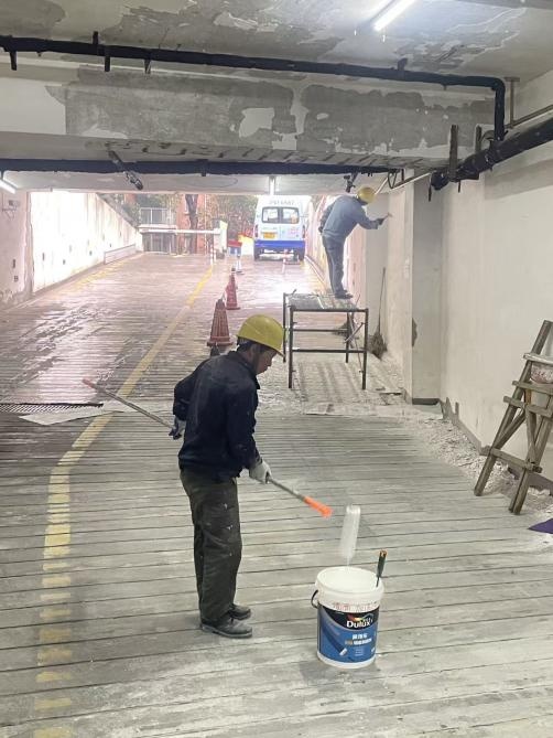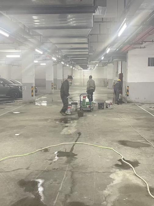 金淞家园建成年代较早,地下车库长期受车辆碾压、雨水渗透影响,地坪多处出现裂缝、起砂、空鼓、积水等问题,不仅影响环境美观,更存在行车打滑、行人绊倒等安全隐患,成为业主日常出行的“揪心事”。