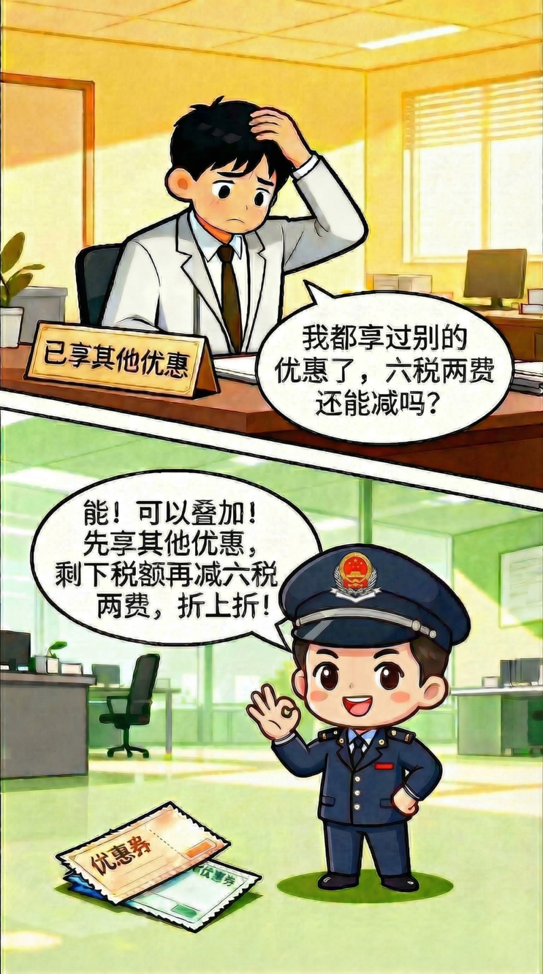 增值税小规模纳税人、小型微利企业和个体工商户已依法享受其他优惠政策的,可叠加享受“六税两费”减免优惠。在享受优惠的顺序上,“六税两费”减免优惠是在享受其他优惠基础上的再享受。原来适用比例减免或定额减免的,“六税两费”减免额计算的基数是应纳税额减除原有减免税额后的数额。