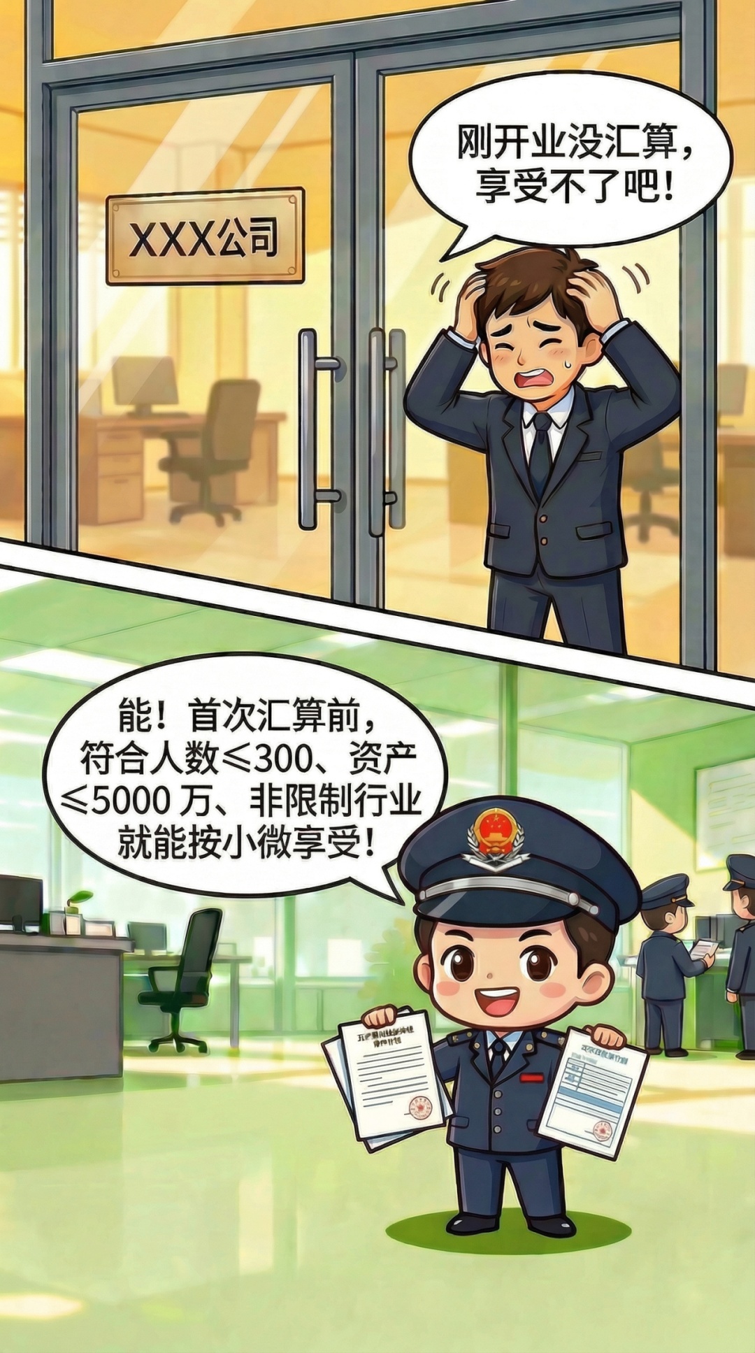 登记为增值税一般纳税人的新设立企业,从事国家非限制和禁止行业,且同时符合申报期上月末从业人数不超过300人、资产总额不超过5000万元两项条件的,在首次办理汇算清缴前,可按照小型微利企业申报享受“六税两费”减免优惠。