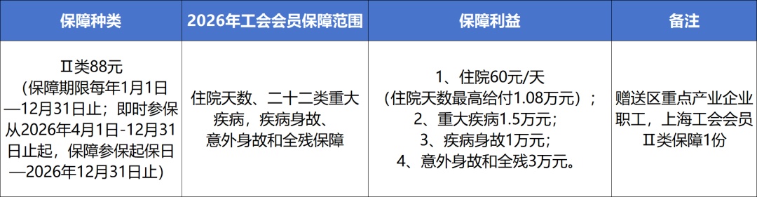 根据上海市总工会《关于开展2026年上海工会会员保障集中参加保障工作通知》《上海工会会员保障资金管理办法》《上海工会会员保障结余资金返还的通知》等工作要求,以及普陀工会工作实际,推动企业建会和职工入会,拟对区重点产业中,加入工会的企业职工赠送上海工会会员Ⅱ类保障1份,满足职工医疗需求,减轻企业经营负担,为建立和谐企业和助力企业发展构筑一道健康防线。