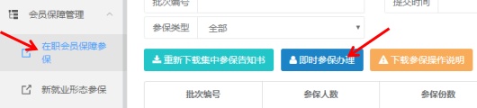 4、在工作平台-“业务工作台-会员保障管理-在职保障会员参保”点击即时参保办理,进行待参保名单确认,待区重点产业企业确认后,保障类型确认(三选一)、选择Ⅱ类保障1份,提交至普陀区各街镇总工会审核。