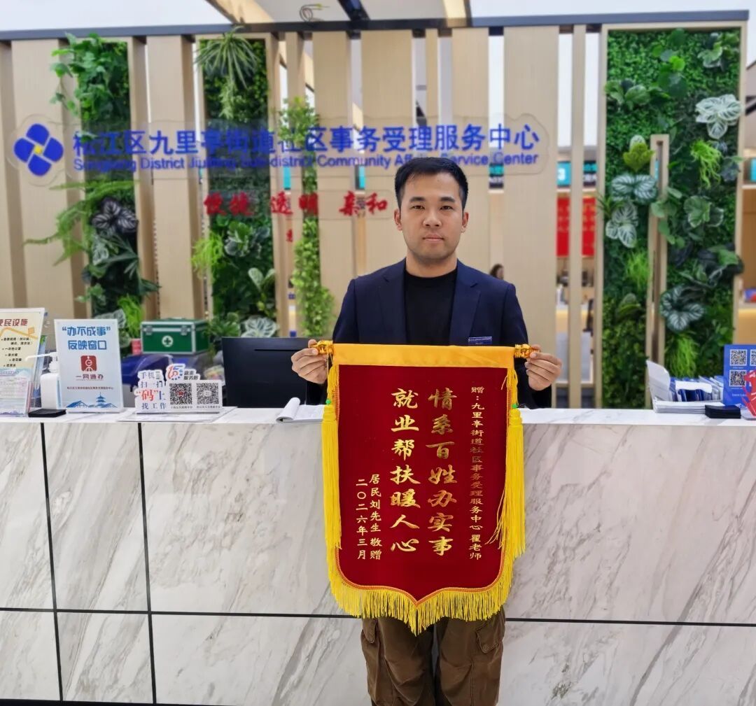 从深秋到初春,近五个月的精准帮扶,不仅让刘先生重新走上工作岗位,更让他感受到了基层就业服务的温度与力度。正式入职后不久,刘先生利用午休时间,专程回到中心,将锦旗送到瞿佳彬手中并再三表示感谢。